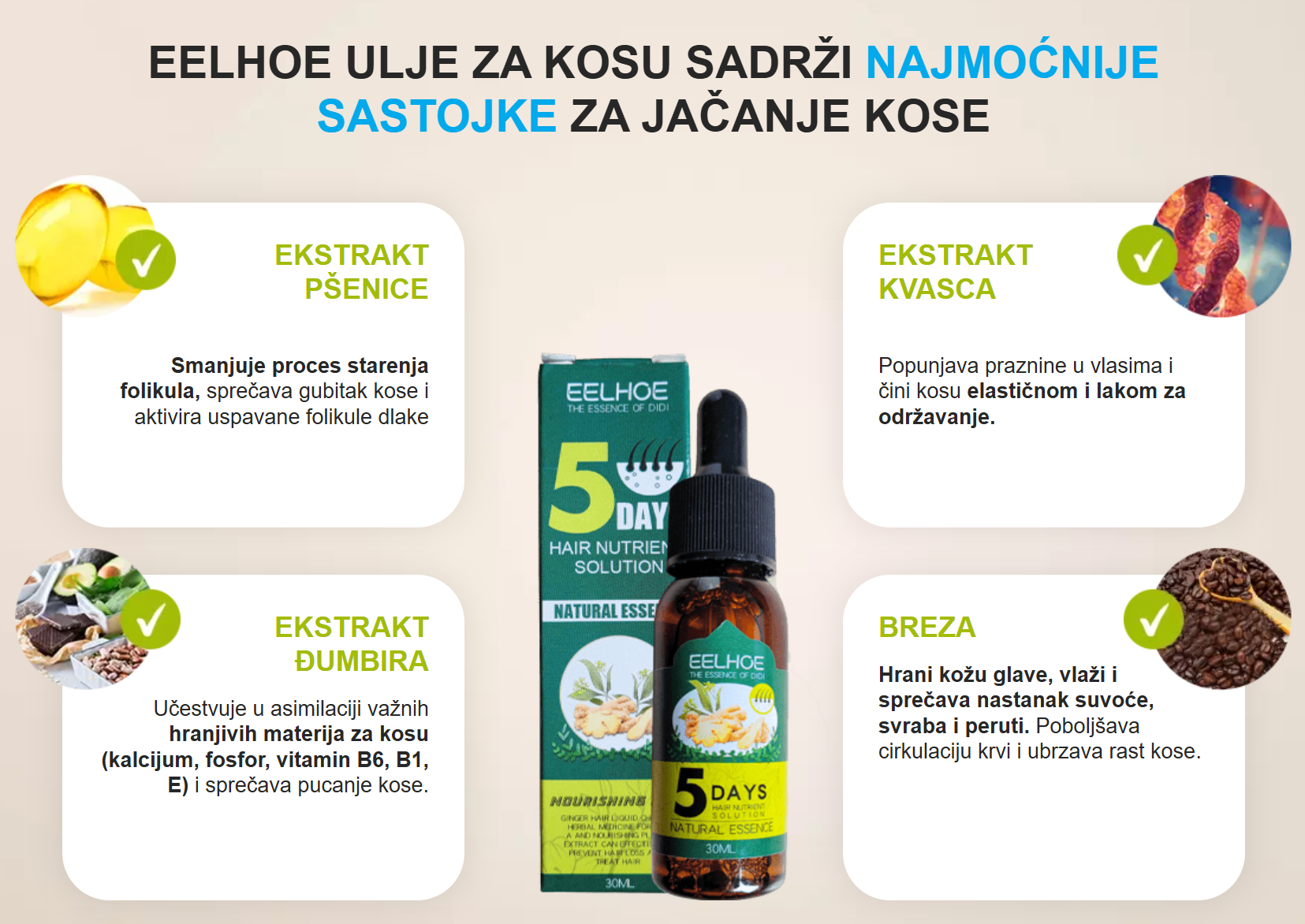 Transformišite svoju kosu u samo 5 dana pomoću našeg revolucionarnog 5 Days - Magičnog Seruma Za Kosu. Ovaj napredni serum dubinski hrani i obnavlja vašu kosu, potiče brži rast i vraća joj prirodni sjaj. Idealno rješenje za one koji žele bujnu, zdravu i otporaniju kosu, bez obzira na prethodna oštećenja.